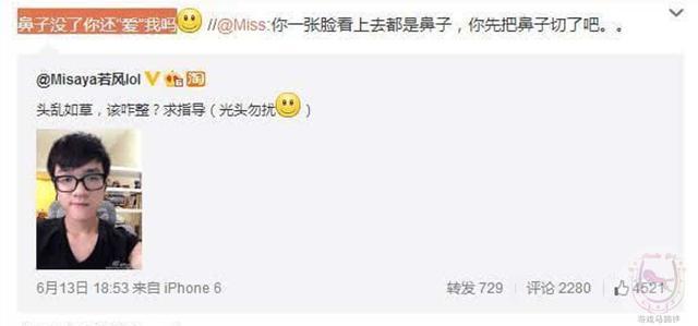 曾经若风就“调戏”过Miss,被外界解读为“大胆示爱”。只是,若风的鼻子实在是太标志了...占面部的五分之一。其实,从个人成就上来看,若风还是蛮配Miss的。前dota成员,前LOLWE的队长,拿过世界冠军,通知过中国的LOL界,带起了卡牌风。