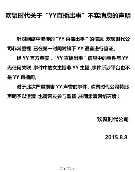针对网络中流传的“YY直播出事”的信息,欢聚时代公司非常重视,第一时间对旗下YY语音进行查证。经YY官方查实,“YY直播出事”信息中的事件与YY无任何关联,当事人非YY主播,事件所涉平台也不是YY直播间。对于此次严重损害YY声誉的事件,欢聚时代公司特此声明澄清,也请网友参与监督,共同肃清网络环境。