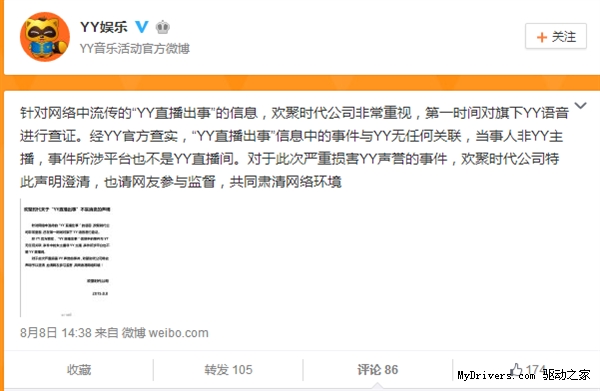 事情发生后不久,@YTY娱乐官方微博对此事进行了回应。YY表示,第一时间对旗下YY语音进行了查证,但经过查证之后发现,“YY直播出事”信息中的事件与YY无任何关联。