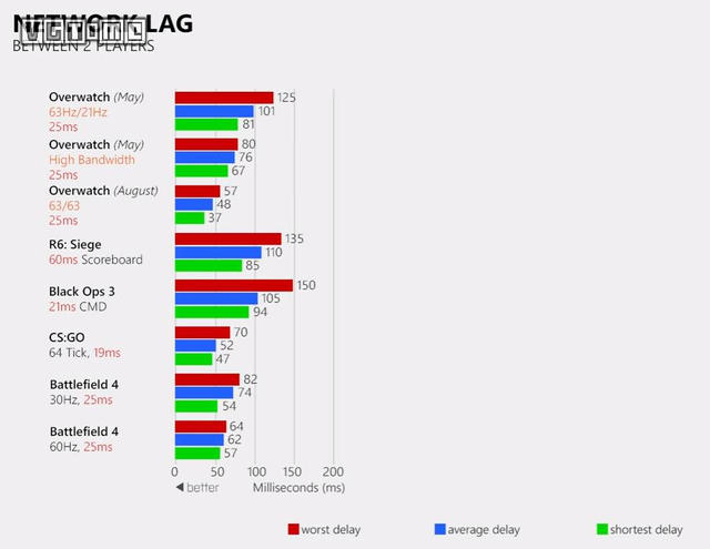 经Youtube播主 Battle (non)sense 的测试,更新 63Hz tickrate 之后《守望先锋》的响应速度有了质的提升,在目前市面的主流竞技FPS中已经位列前茅,甚至高于以响应迅速著称的《反恐精英:全球攻势》的标准模式64Hz服务器(如下图),不过 CSGO 还有 tickrate 高达128Hz的竞技模式专用服务器,此为后话。