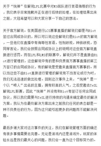 在LPL和LMS的联赛中,解说们并不是直接由Riot进行管理的,这些解说中有德负责官方赛事直播的第三方签订的合同或协议,有的解说是受邀来直播官方赛事的。所以当这些不由Riot直接进行管理的解说有不当言论或行为时,我们无法迅速的做出处理。回到这次事件中来,“统神”是一个以“喷人”出名的主播,拥有较高的人气,之后受邀去TeSL解说LPL联赛,因此“统神”并没有和Riot有签订任何合同或协议,所以我们需要与TeSL进行持续的沟通来确定最终的解决方案。我认为在最终解决方案出来之前我们任何的表态都是一种不负责任的行为,因为这只能引起更多的问题而不能解决问题。