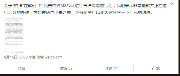 之前我们了解过**解说统神辱骂M3队员的事件。在当事人“亚洲桶神”在之后私人直播时回应说“铜银牌的解析跟我的想法当然有落差”,并表示倾向继续保持自我风格。之后,M3战队向拳头官方投诉。8月15日凌晨,官方玩家分析师Riot_Guan在微博发文,宣布拳头官方开始着手处理此事。
