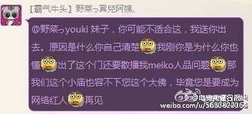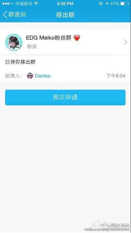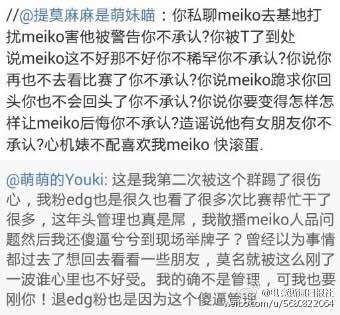 昨天晚上九点多,一名自称被二度T出EDG选手meiko粉丝群的女子@萌萌的Youki发表微博怒刚管理,宣称自己对meiko和EDG战队的爱真的不能再真,群管理随即爆料:该女子曾去基地骚扰meiko选手并在被警告的情况下仍然久久不愿离去,在死缠烂打未果后甚至四处造谣称meiko选手有女朋友等,哭诉就算meiko跪求该女子回心转意也不会再加入粉籍。meiko从MSI的一战成名到夏季赛季后赛的有点梦游,难道是真的因为成名之后膨胀导致的吗?