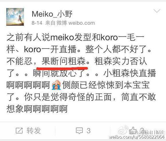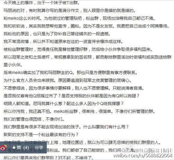 23时23分,meiko粉丝群管理翼儿@Meiko_小野召开新闻发布会,表达了自己对meiko选手一腔热忱真爱无瑕并说道“meiko粉丝群,很单纯,很简单”,怒斥污的一众人等,最后表示不再接受任何正面刚。以下为翼儿聚聚的发言稿。