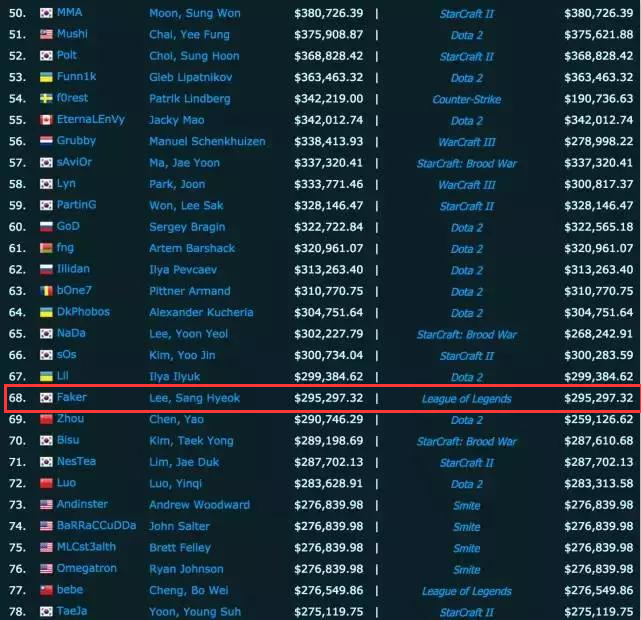 选手奖金收入榜,LOL著名选手faker收入仅排第68位
