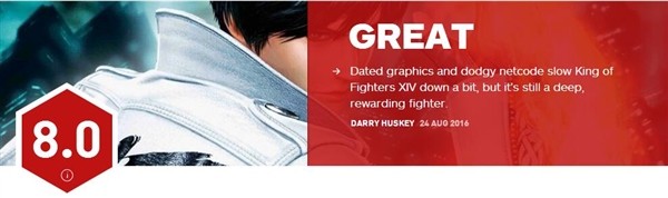 《拳皇14》是一个庞大复杂的游戏,上手的确有一些挑战。花时间探索与掌握这些格斗家的复杂能力考验着玩家的耐心与能力。但对于那些喜欢挑战的玩家,这是非常棒的体验。尽管游戏的画面有些落后,网络状况不佳,IGN还是给出了8.0分的评价。