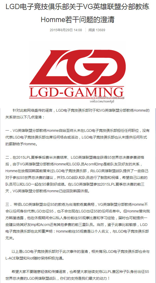 由于前LGD战队教练Chris出走事件风波中涉及到了VG战队教练Homme,谣传Homme将离开VG战队,并将加入LGD战队。对此今日LGD战队官方微博发出了消息,对于之前网络谣传的VG教练Homme将加入LGD征战S5事件进行澄清。
