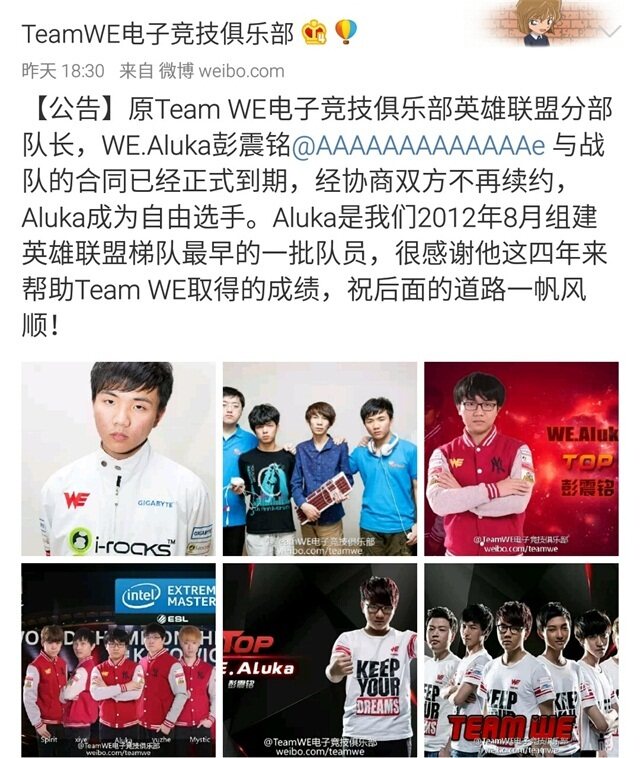 “原TeamWE电子竞技俱乐部英雄联盟分部队长,WE.Aluka彭震铭与战队的合同已经正式到期,经协商双方不再续约,Aluka成为自由选手。Aluka是我们2012年8月组建英雄联盟梯队最早的一批队员,很感谢他这四年来帮助TeamWE取得的成绩,祝后面的道路一帆风顺!”