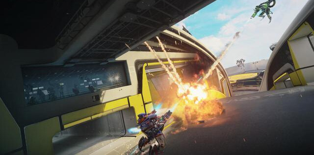 谁晓得排了半天队之后,试玩区门口的工作人员竟然告知我们试玩对象没得选,我被安排到的游戏是融合了射击和体育要素的对战类游戏《RIGS》。没错,就是卡尔文妖在E3上玩到的那款,当时他还写了详实的试玩报告,所以具体玩法这里就不介绍了,就稍微补充一点我个人的体验。