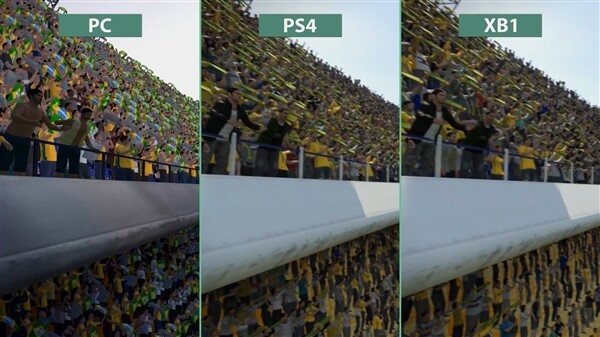 外媒在报道中表示,《实况足球2017》在PC上缩水最直观的就是画面,PS4和Xbox One版本中拥有预告片一般的光照、天气、汗水等等逼真细节,而这些在PC版上却消失了,取而代之的依旧是死板的橡胶人和毫无立体感的草皮。场边的观众也可以说是惨不忍睹。