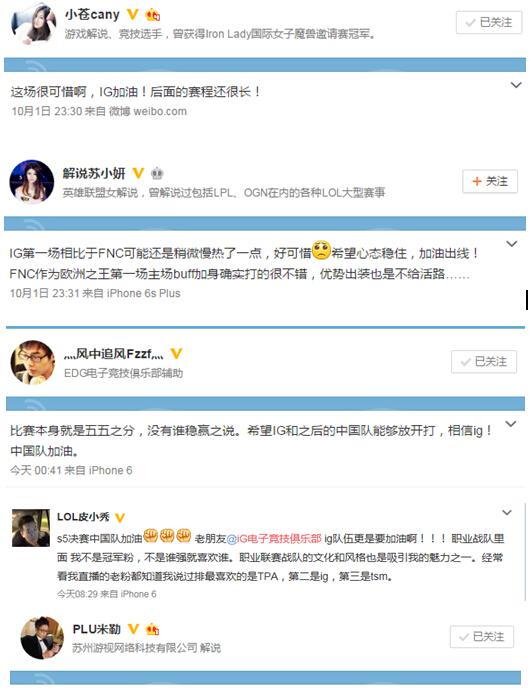而面对这一次的失败,中国观众和玩家选择了理智对待,微博中的职业解说、选手和主播纷纷表示“iG加油,调整状态”。而众多玩家也选择了在战队官方微博下进行评论,鼓励战队和选手,希望在接下来的比赛中看到那个经常能带给我们惊喜的iG。