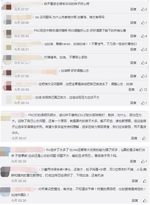 在微博的评论中,我们可以看到,玩家们在观看比赛之后表示“FNC实力好强”,也表示“iG需要调整状态和心态好好发挥,一定没有问题”。iG需要在比赛中累积经验并不断地完善自己的打法,希望iG能再这一次失败之后积累经验,在接下来的比赛中,用最好的状态迎战每一队的选手。