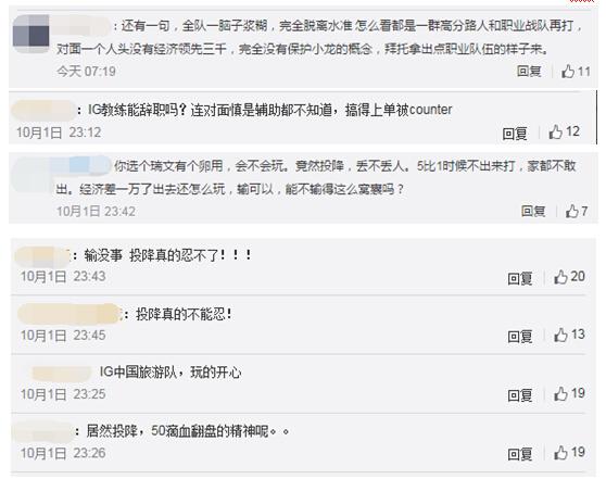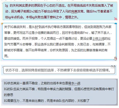 在一片鼓励的言论中,也有一些比较简单粗暴又直白的支出iG短板的玩家,主要都是针对iG选择主动投降的问题。在这里,小编想要说一句,iG选择投降不失为一个正确的选择,如果在昨天的状态下选择继续和FNC打下去,很可能对选手的心情造成巨大的影响,在昨天30分钟对面上高地、己方未破对方一座外塔的情况下,即使拖到最后,也几乎没有任何翻盘的希望,不如早点结束比赛,回去好好总结,在下一次比赛中打出属于iG的节奏。