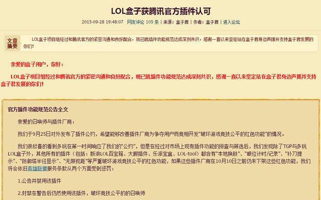 大体意思就是,除了TGP与多玩LOL盒子,其他插件都是第三方不合规插件,如果10月10日前违规功能不下架的话,就要开始处罚了。