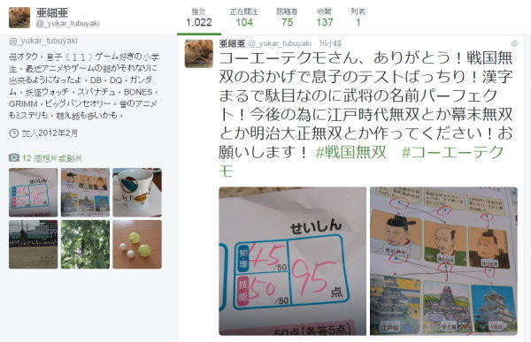 这位母亲提到,因为古代武将对于这年龄的学童而言,充满著复杂难记的汉字名字、另外还有名人居住的城市等考题,但儿子在玩了这款游戏之后,却能牢牢地记住,让孩子的历史和地理概念有很大的进步。看到孩子的成绩大跃进,她向游戏公司喊话“为了孩子的学业,就拜托你们把江户时代无双、幕末无双,还有明治大正无双什么的也一起做了吧!拜托你们了!”