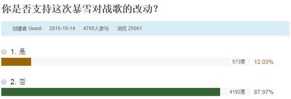 在这个改动出来之后,我在中国的玩家中发起了一个投票,在不到10个小时以内近3000多名玩家中有88%的玩家不支持这个改动,几乎所有的知名玩家和主播都站起来反对这个改动,如果这都不能说明一些问题的话,难道暴雪你还坚持你永远是对的吗?真不觉得冠军的试炼是个成功的扩充包,从纳克萨玛斯开始的每一个扩充包几乎没有一个给人惊喜的感觉,显得一个比一个没有创造力,暴雪一直在冠军的试炼宣传中推崇的激励机制,天梯主流套牌和比赛中我几乎连一张用到这个激励机制的卡都没有看到,难道这不是问题吗?开发者们,看看外面的世界!