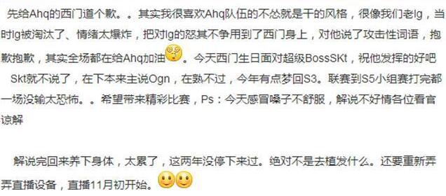 疑似因为笑笑解说时辱骂了AHQ的中单西门,说他是“脑瘫”,因此提前结束解说,昨天回国。缺少了笑笑这样的解说着实可惜。