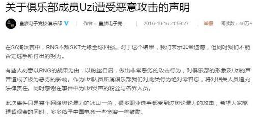在S6总决赛中,RNG被SKT以3:1 击败,无缘四强,赛后大家对于比赛结果都有发出了不同的看法,有理解的,有支持的,当然也有恶意攻击队员的。本月16日,RNG俱乐部发布声明:谴责UZI遭受到的网络暴力。