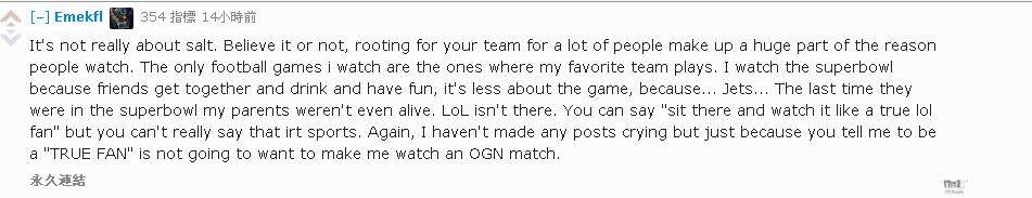 Emekfi:这不是什么在伤口上撒盐,不管你信不信,很大一部分人观看总决赛都是因为自己心爱的战队参与进来了,我所看的唯一足球赛事就是为我最爱的队伍加油。我去看超级碗是因为和朋友在一起喝酒开心,而不是比赛本身如何.....最近一次去看超级碗时我父母甚至都已不在.....你可以说“安静坐在那儿像个真正的LOL粉丝一样看比赛”但你无法告诉自己纯粹就是看比赛而已。