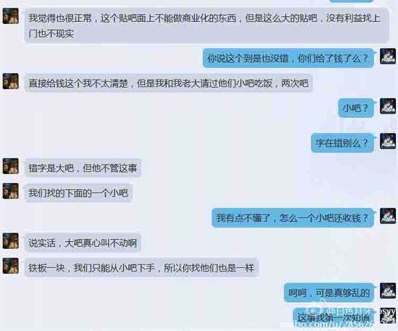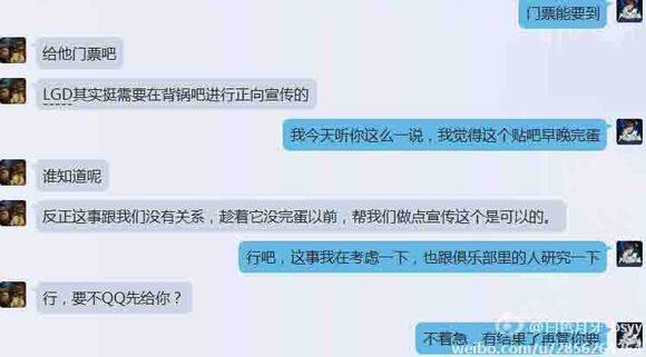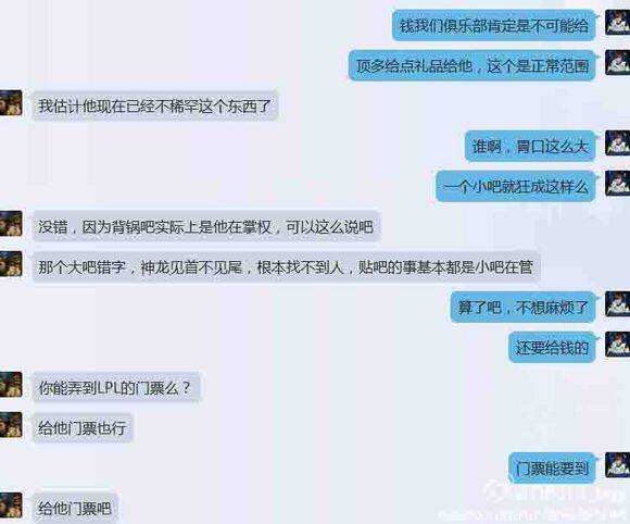 聊天截图透露出其希望给战队做一些宣传,不想被告知需要预先支付吧务一定的“好处费”,其本人对这种潜规则表示不解,对方又表示如果不想要用钱,也可以用LPL的门票来收买,并且最后答应给某小吧务的QQ号进行下一步交涉。
