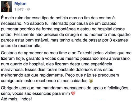 S5世界总决赛的巴西外卡队PaiN Gaming的上单选手Mylon因为肺萎陷,在周六被送进了医院。不过目前病情稳定,进行一些检查后就能出院了。