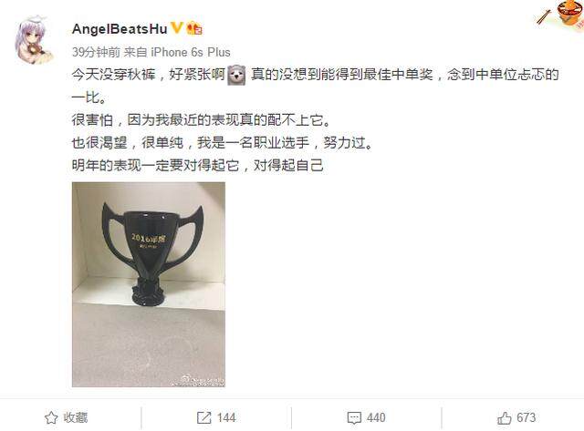今天没穿秋裤,好紧张啊真的没想到能得到最佳中单奖,念到中单位忐忑的一比。