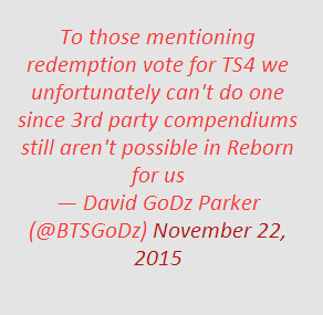 Godz在他的推特中提到,本届TS4将不会设有救赎投票功能——即第三方投票复活参赛队伍。推文中提到的救赎投票的预留了队伍的位置,但是这8支参赛队伍(一支直接受邀、一支救赎投票选出、另外6支地区赛产生)中,还有2支队伍未曾公布。