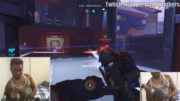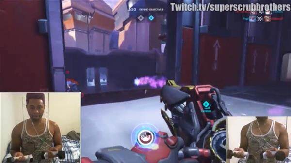 细心的玩家可能发现了,他就是之前用“刀”玩源氏的那个主播。上次他用的是Wii体感手柄改造的刀型控制器,这次则是直接用了Wii 的哑铃型外设。