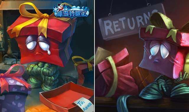 为了表达对安妮的爱慕,木木绞尽脑汁,在圣诞节别出心裁地把自己包装成礼物送给安妮,然而却遭遇了无情的退货(左边为国服原画,右下角是礼物标签:给安妮;右边为美服原画,挂牌上英文意为退货):