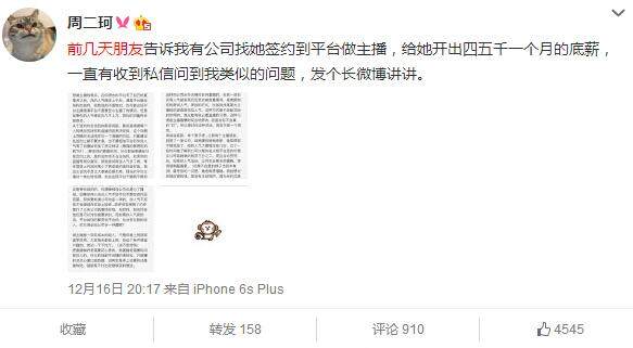 昨日主播周二珂在微博发文表示一直有人问她关于做签约主播的相关问题,于是发长微博表态,爆料了某三方公司的一些黑幕,原文如下: