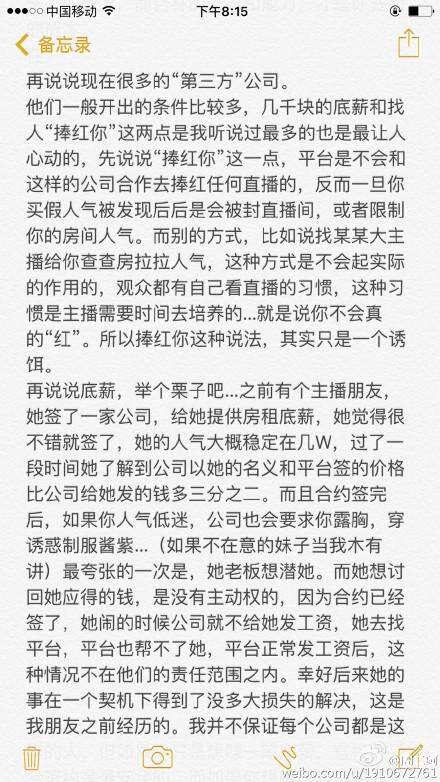 3.曾经有三方公司会用新主播的名义跟平台签约,而且本该是平台给主播的钱却被公司拿掉,然后只给主播一部分。而且有可能面对老板的潜规则,人气低了逼你露,想闹就不发工资,到时候平台也帮不了你。