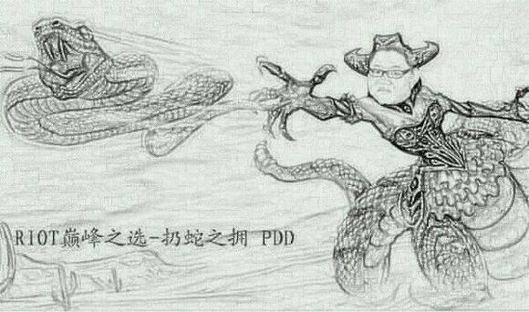缘起WE粉丝和IG老队员之间的矛盾,也是当时国内天团WE走向衰落时的标志性事件。SWL上WE和IG会师决赛,最终输给了IG,兴奋的PDD不断挥舞手臂,后来有WE的粉丝不满向PDD扔水瓶,现场发生口角。而随后,PDD的挥手的图片被PS扔蛇,这个梗由此而来。